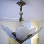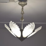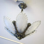 De kroonluchter heeft een verzilverd metalen frame met zes grote platen van gegoten persglas in de vorm van gestileerde palmbladeren.