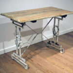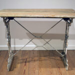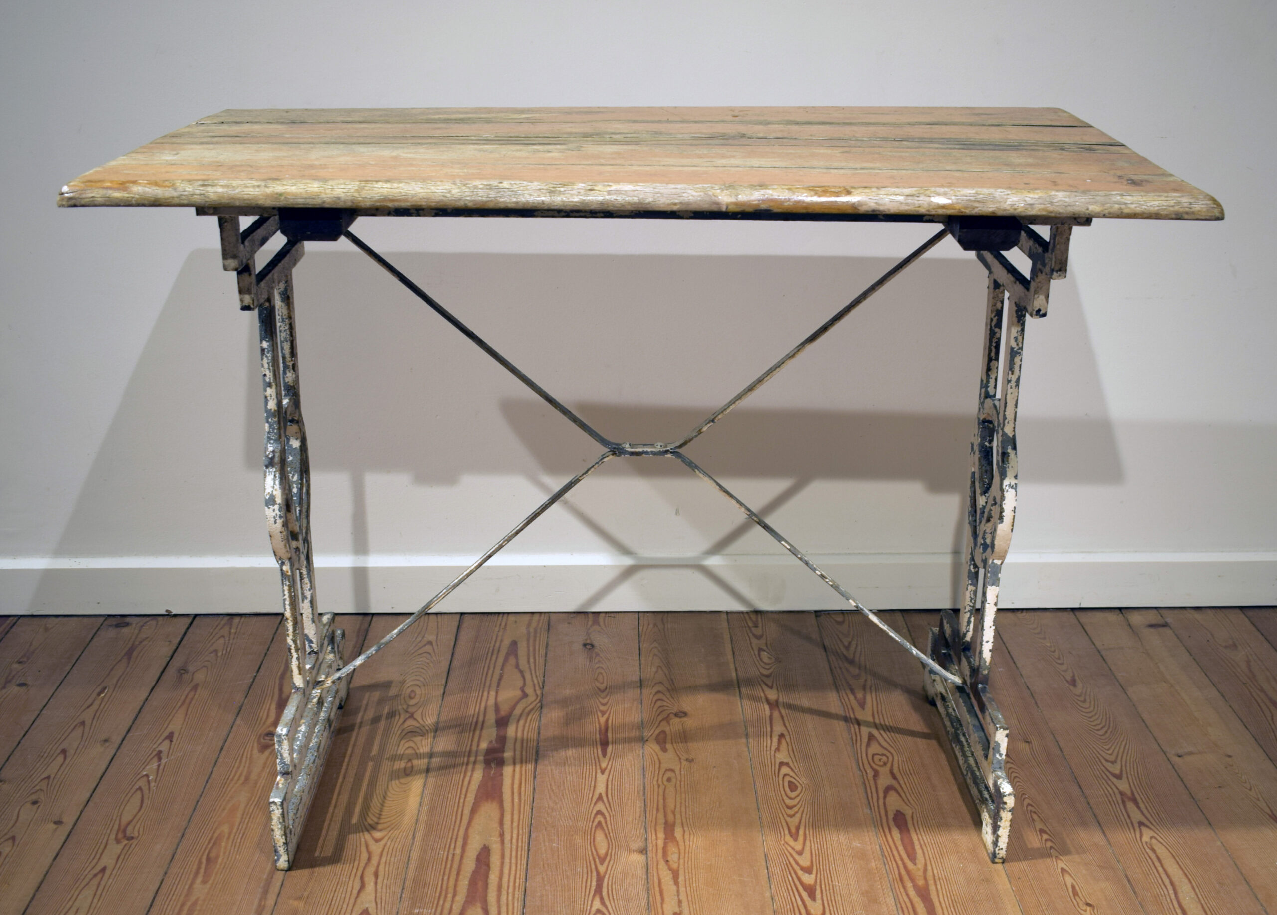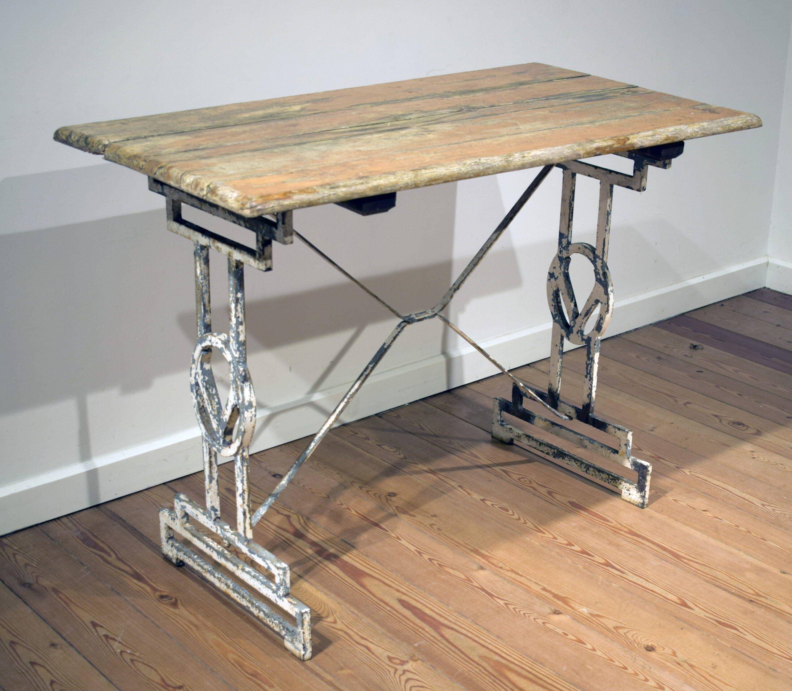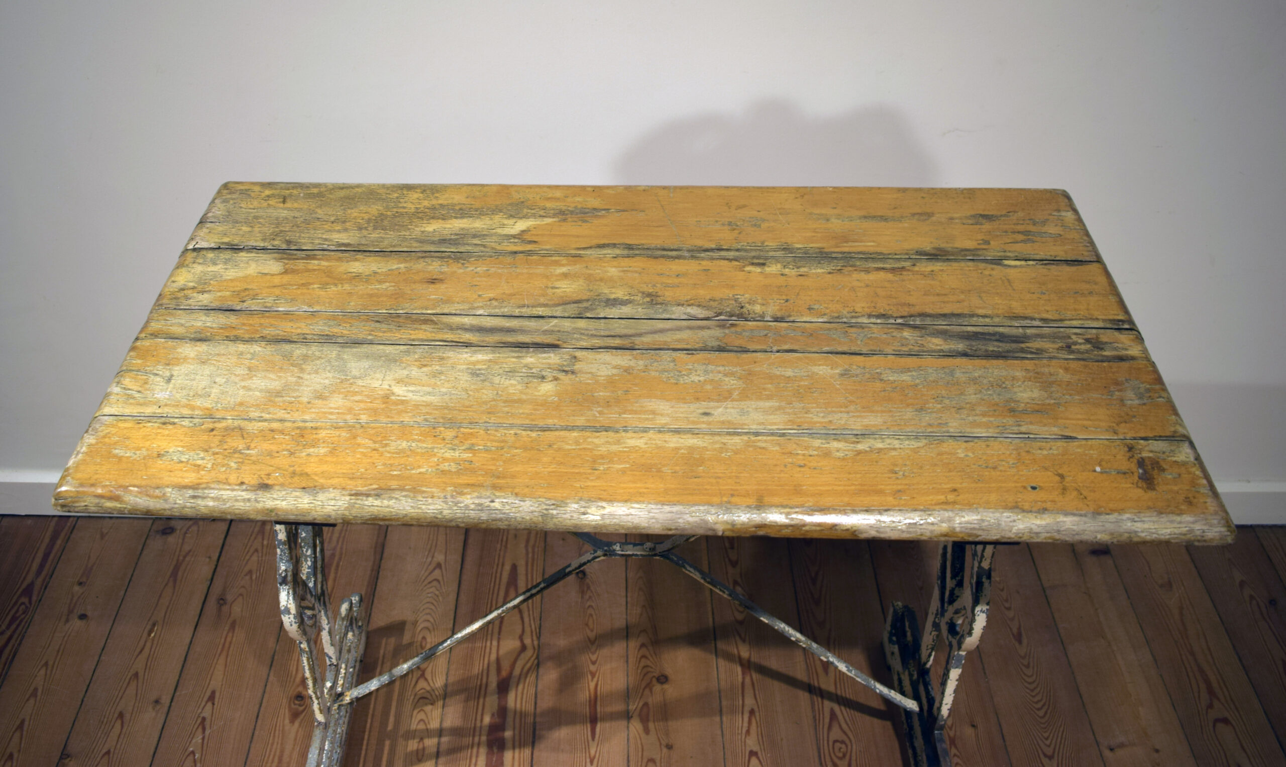 A rare rectangular cast iron bistro table from the interwar period, originating from the thermal baths of Vittel (France). The shape of the legs is in the typical angular Art Deco style, incorporating the āVā of Vittel. The table, which still has its original wooden top, is in beautiful vintage condition. It is a real collector’s item!